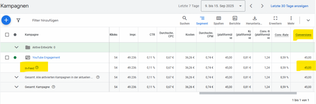 Die Darstellung zeigt dir dann alle Formate separat an: YouTube In-Stream, YouTube In-Feed und YouTube Shorts – jeweils mit eigenen Performance-Daten.