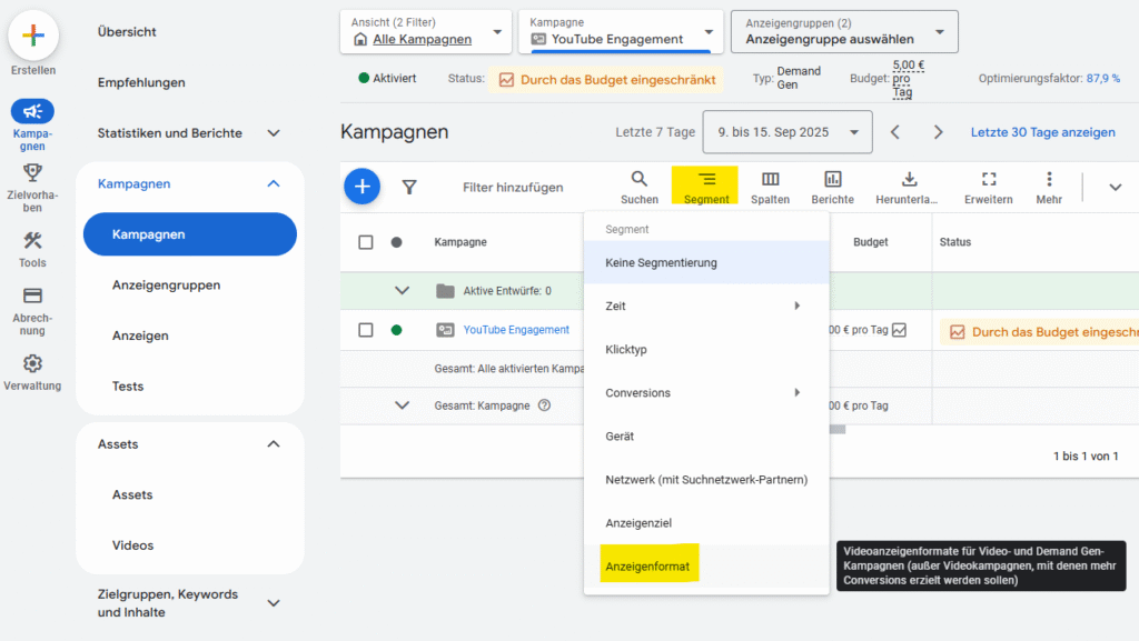 - Überprüfe deine Demand Gen-Kampagnen. Schaue dir die neuen YouTube-Breakdowns an und identifiziere das beste Format